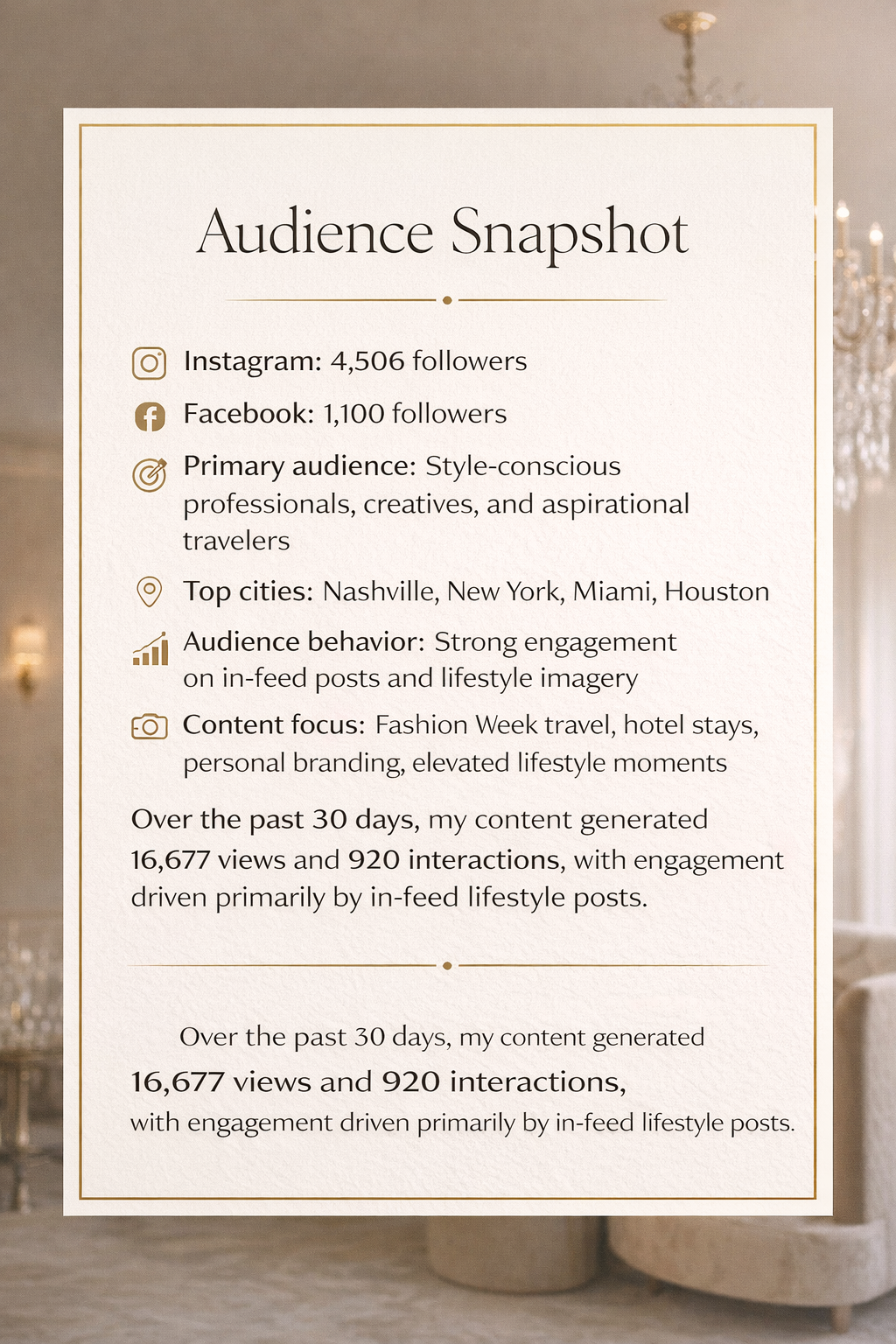 I partner with hotels and lifestyle brands to create polished, brand-safe content that positions properties as part of high-visibility cultural moments, including New York Fashion Week, Miami Swim Week, and global industry events.